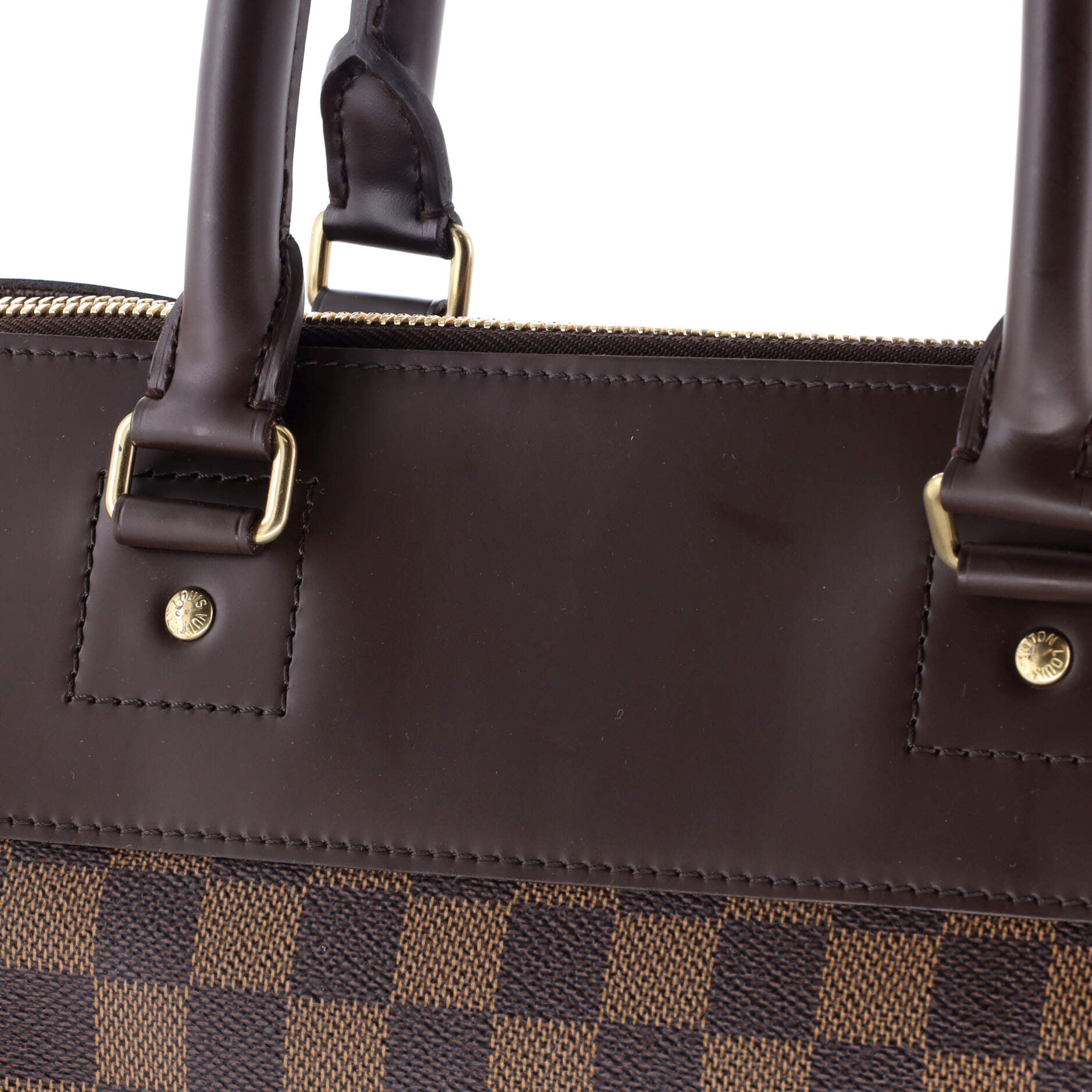 Condition: Very good. Exterior: corner wear, edge wear, creases, scuffs | Handles/Straps: scuffs, discoloration | Interior: discoloration, scuffs, moderate odor | Hardware: scratches, tarnished