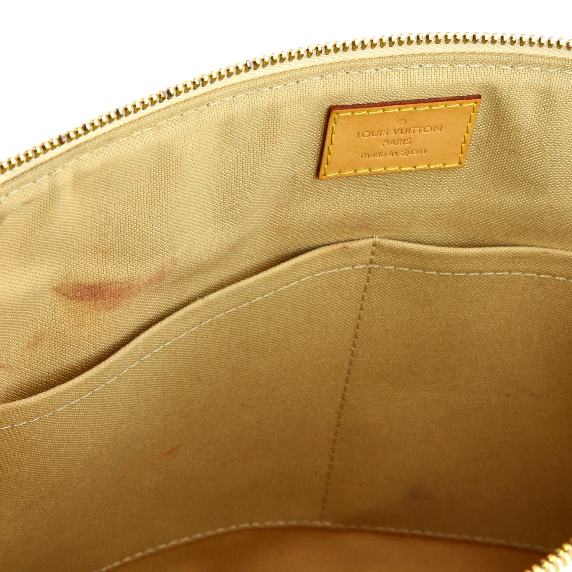 Condition: Good. Exterior: heavy corner wear, edge wear, discoloration, scuffs, minor creases | Handles/Straps: minor creases | Interior: stains | Hardware: minor scratches