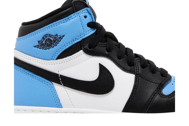 The Air Jordan 1 Retro High OG UNC Toe (GS) is a grade-school sneaker featuring a white and black leather upper with University Blue accents. Inspired by Michael Jordan's college colors, this shoe includes classic details such as a Nike Swoosh, Air Jordan logo, and Wings logo. The shoe's midsole contains Air-sole cushioning for comfort, while the rubber outsole offers traction with a Tar Heel blue color. The high-top design provides ankle support, making it suitable for various activities. Released on July 22nd, 2023, this sneaker is a stylish and functional addition to any collection.