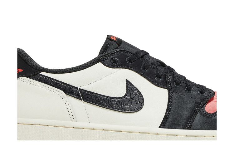 The Jordan 1 Retro Low OG PSG Paris Saint-Germain features an all-leather upper in sail white with an off-noir black overlay and Swoosh. The pink toe box includes dimples and a gradient finish, while the Paris tongue tag is embroidered in red. A red Jordan wings logo accents the heel, and the black outsole contrasts with the off-white midsole. Released on October 1, 2024, the Jordan 1 Retro Low OG PSG Paris Saint-Germain is available now at Side Kicks.