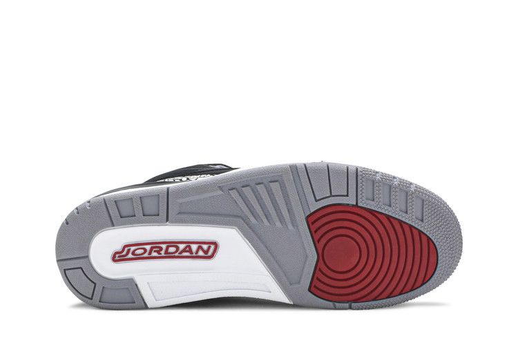 The Air Jordan 3 Retro OG "Black Cement" features a black leather upper with cement grey, fire red, and white accents, along with elephant print detailing. This 2018 remastered edition reintroduced the original "Nike Air" branding for men's and gradeschool sizes, while preschool and toddler sizes feature "Jumpman" branding. Released on February 17, 2018, the Air Jordan 3 Retro OG is available now at Side Kicks.