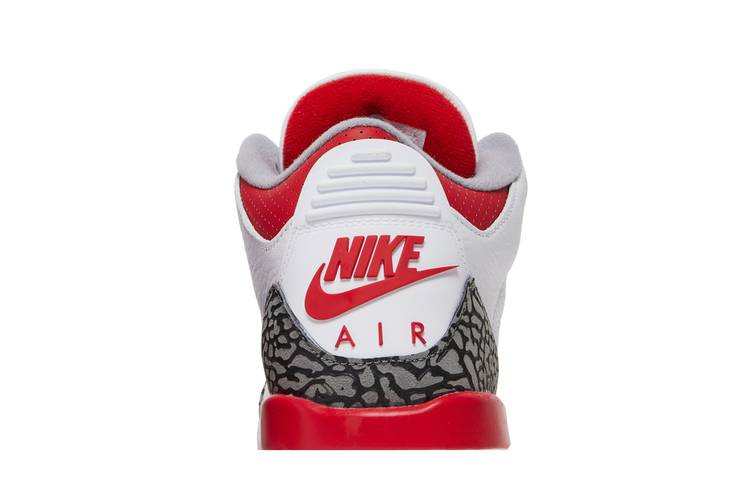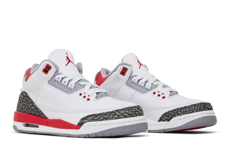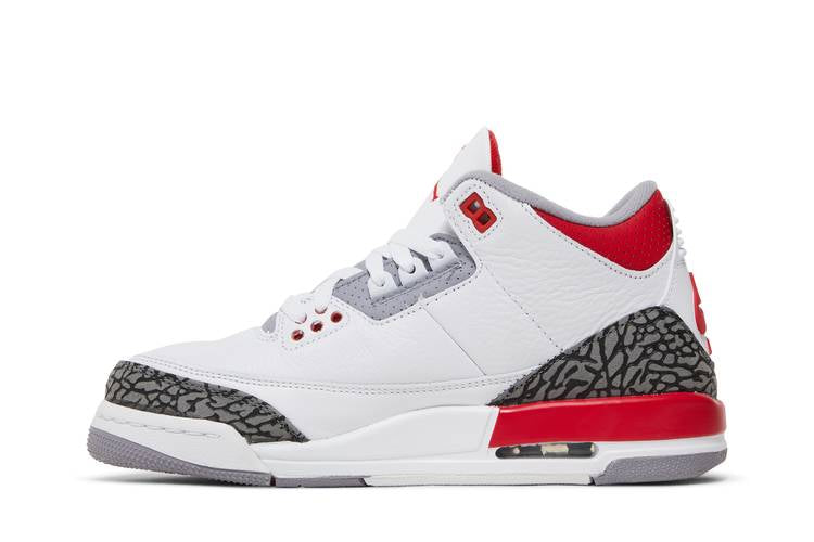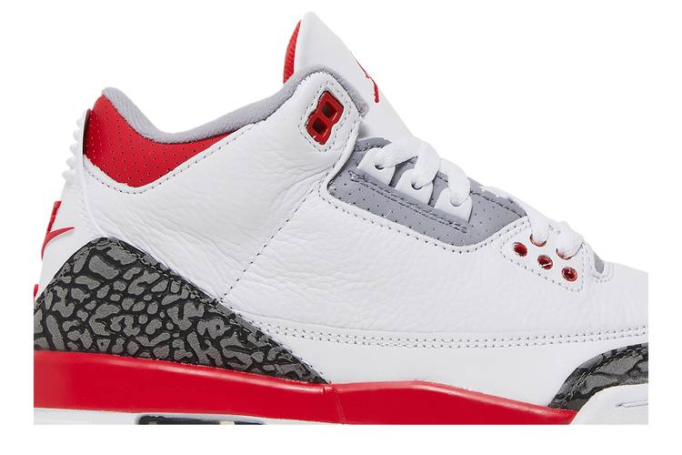 The Air Jordan 3 Retro Fire Red (2022) (GS) is a classic sneaker designed for big kids. Featuring a white tumbled leather upper with elephant-print overlays, this mid-top shoe includes scarlet accents on the Jumpman logo and Nike Air branding. The polyurethane midsole boasts a visible Air-sole unit for added comfort and style. Inspired by the original 1988 model, this shoe combines iconic design elements with modern touches for a timeless look.