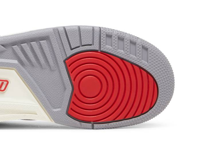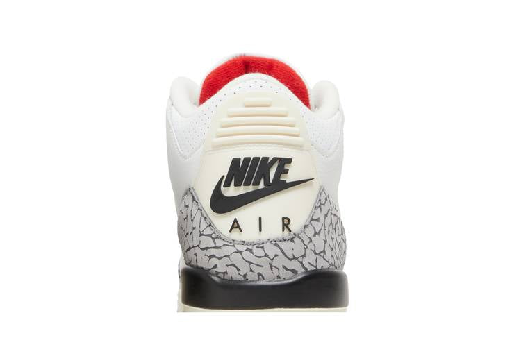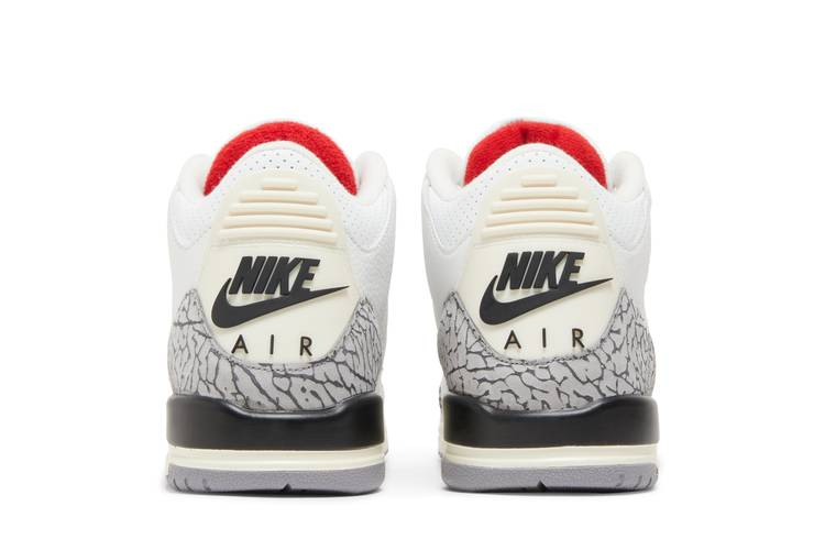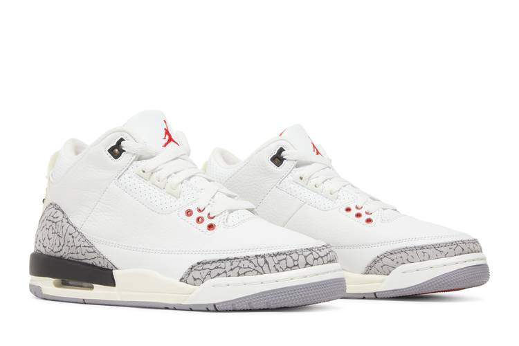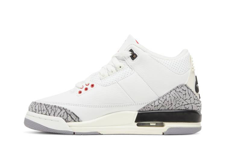 The Air Jordan 3 Retro White Cement Reimagined GS features a white leather upper with grey elephant print overlays, Varsity Red accents, and a crimson Jumpman logo on the tongue. The vintage polyurethane midsole includes an encapsulated Air-sole unit in the forefoot and an exposed unit in the heel. Released on 11th March 2023 to commemorate the 35th anniversary of the Air Jordan 3, this grade school-sized sneaker pays homage to the original design by Tinker Hatfield.
