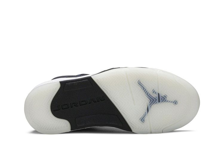 The Air Jordan 5 Retro Oil Grey W features a dark blue leather upper with 3M reflective finish and black quarter panel accents. Embroidered Jumpman branding appears on the tongue and heel. The design includes a white midsole with black shark-tooth graphics and a semi-translucent rubber outsole. Released on January 30, 2020, the Air Jordan 5 Retro Oil Grey W is available now at Side Kicks.