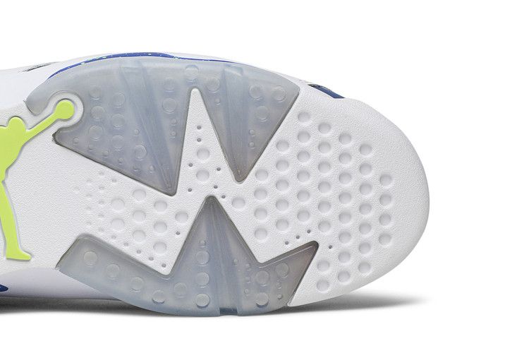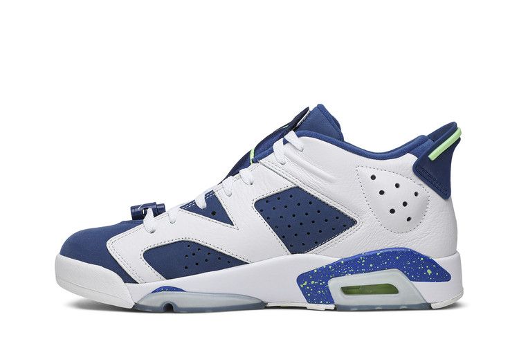 The Jordan 6 Retro Low Ghost Green features a low-top silhouette in a white, Ghost Green, and Insignia Blue colorway. The upper combines synthetic leather and suede with perforated side panels for breathability. It includes lace locks, a heel pull tab, and Nike Air cushioning for comfort. The rubber outsole provides multidirectional traction, while the Jumpman logo appears on the tongue. Released on September 19, 2015, the Jordan 6 Retro Low Ghost Green is available now at Side Kicks.