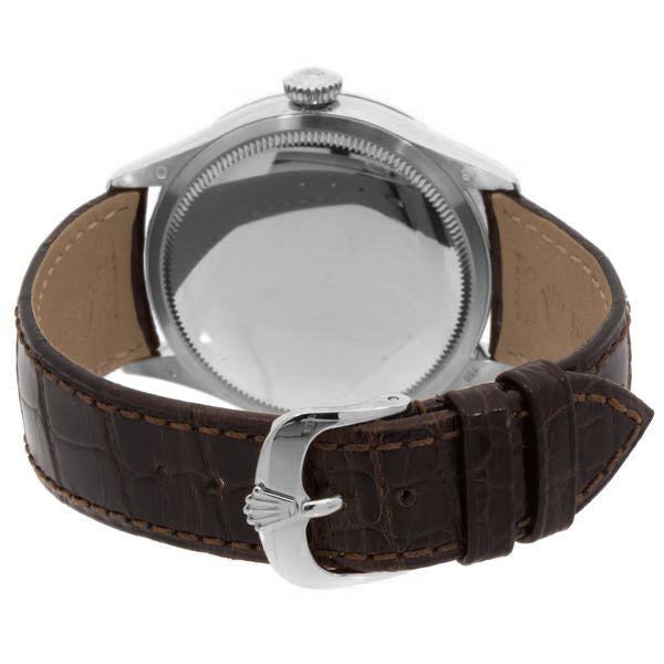 The Rolex Cellini Dual Time Solid 18k White Gold Men's Watch features a polished solid 18k white gold case and a tobacco brown leather strap with a pattern. The domed and fluted fixed double bezel is also made of solid 18k white gold. The black guilloche dial displays index hour markers and a 60 second/minute track. At the 6 o'clock position, there is a GMT second time zone feature along with a day and night indicator. This watch is powered by the Rolex Caliber 3180, a self-winding automatic COSC Superlative Chronometer certified movement with a 48 hour power reserve and 31 jewels. The dial is protected by a scratch-resistant domed sapphire crystal. The case has a round shape and a diameter of 39mm. The flared screw down crown features the Rolex emblem and the 18k white gold tang buckle ensures a secure fit.