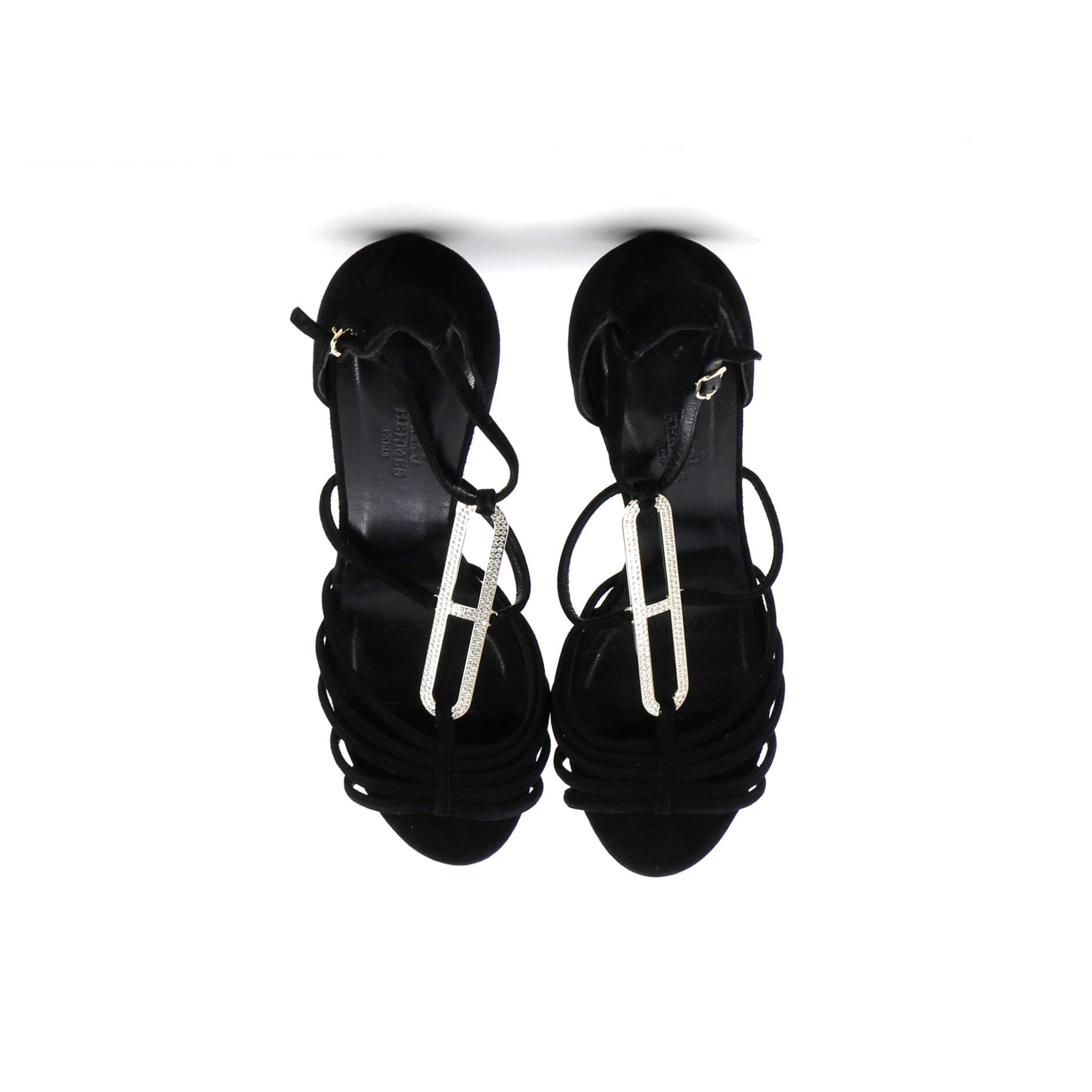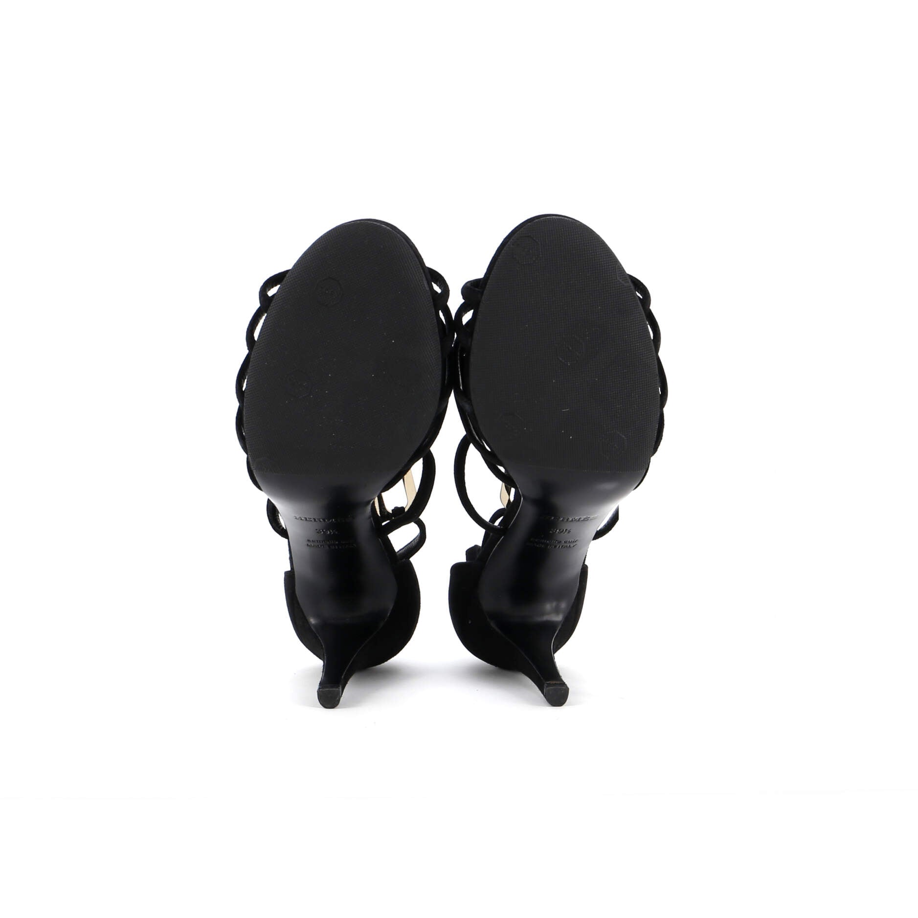 Condition: Very good. Resoled outer soles. Wear and scuffs throughout, creasing on straps, discoloration on insoles, wear, discoloration, and scuffs on outer soles, scratches on hardware.