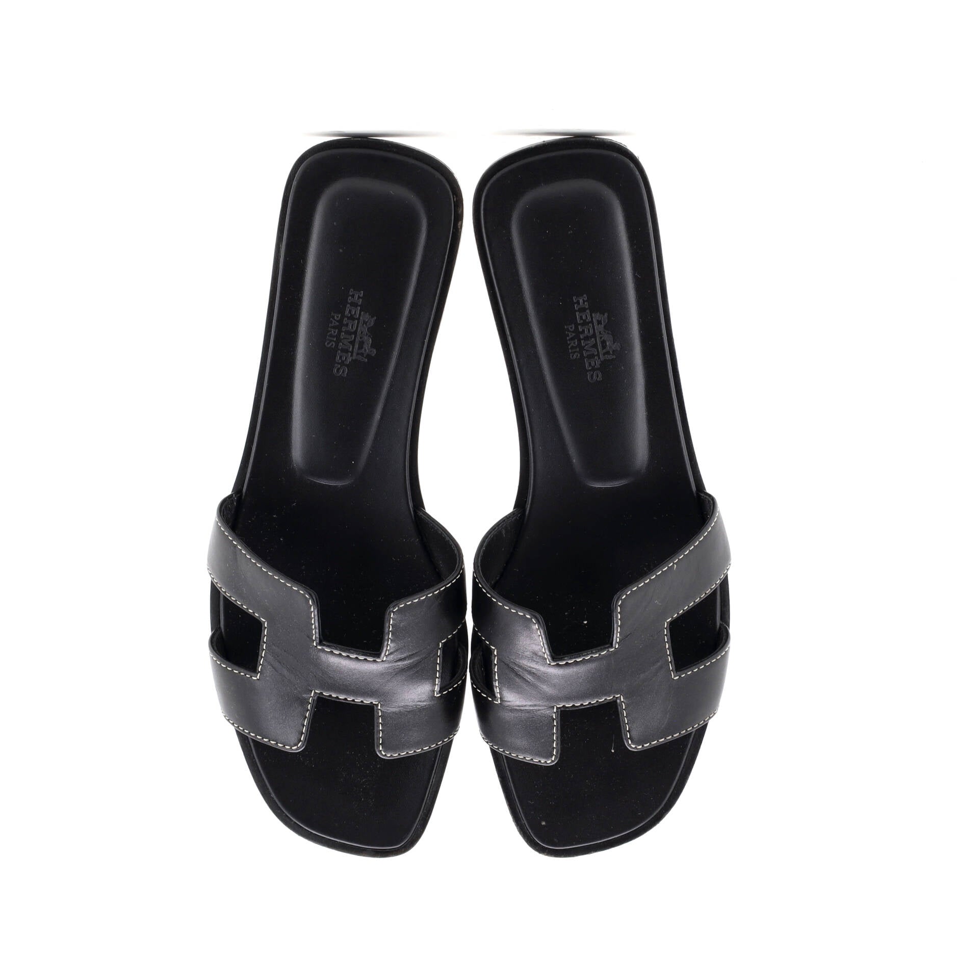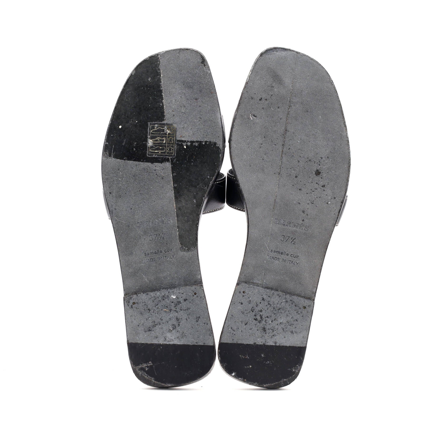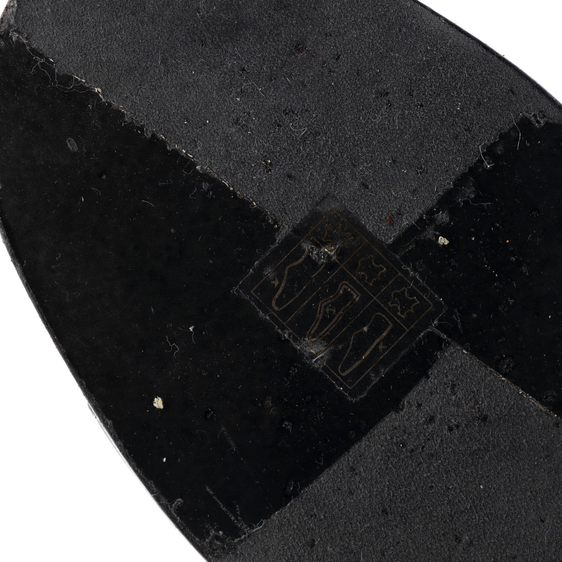 Condition: Very good. Adhesive pads on outer soles. Creasing on uppers, scuffs in interior, moderate peeling, discoloration, indentations, and heavy marks on outer soles.